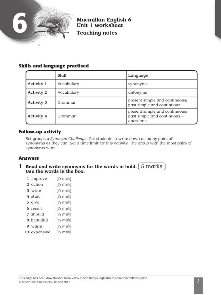 Macmillan English 6 Unit 1 Worksheet Teaching Notes